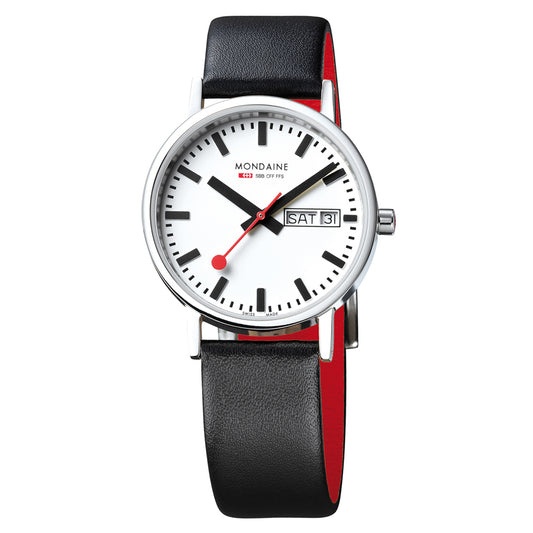 Het iconische Swiss design is herkenbaar uit duizenden en geeft de tijd aan op ieder station in Zwitserland. Door het duidelijke contrast tussen de witte wijzerplaat en zwarte wijzers is de tijd duidelijk afleesbaar. De wereldberoemde gepatenteerde rode secondewijzer met karakteristiek bolletje, kan niet ontbreken.